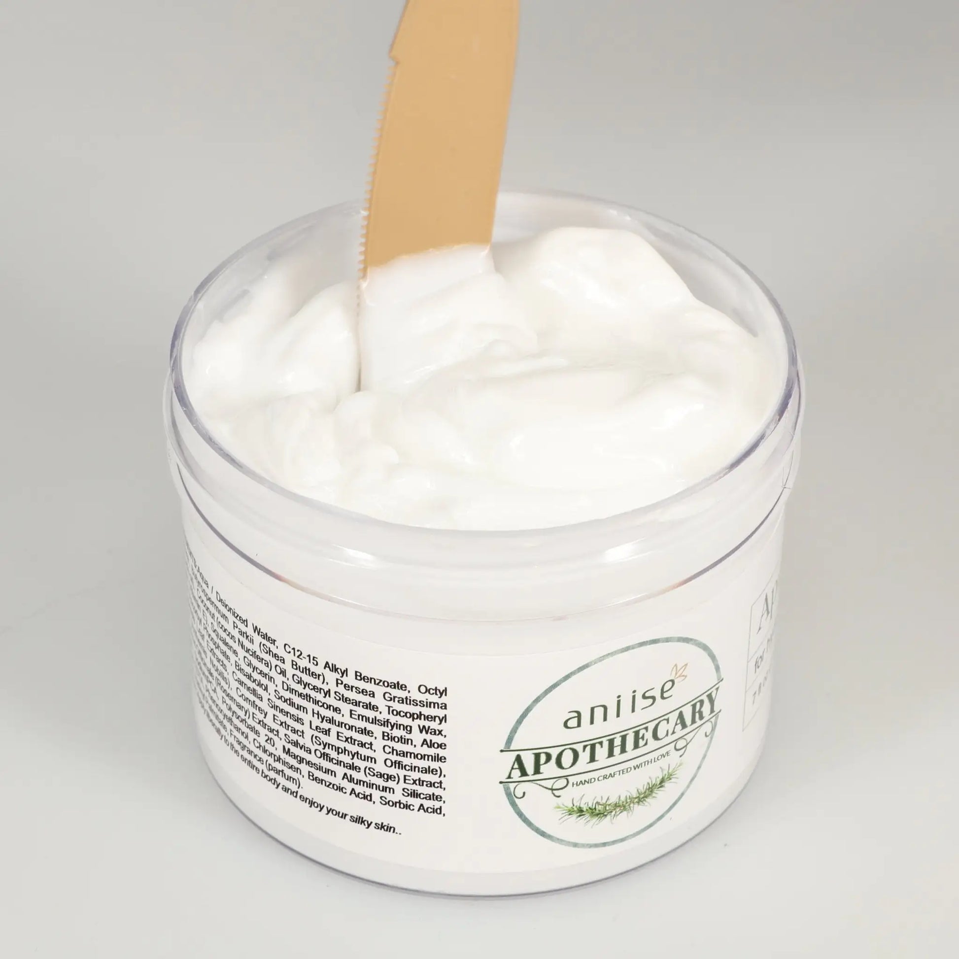 Aqua / Deionized Water, C12-15 Alkyl Benzoate, Octyl Palmitate, Shea Butter, Avocado oil, Coconut Oil, Glyceryl Stearate, Vitamin E, Squalene, Glycerin, Dimethicone, Emulsifying Wax, Sodium Ascorbyl Phosphate, Bisabolol, Sodium Hyaluronate, Biotin, Aloe Vera Extracts, Chamomile Extract, Comfrey Extract, Rosemary Extract, Sage Extract, Pomegranate Extract, Collagen, SodiumPCA, Polysorbate 20, Magnesium Aluminum Silicate, Disodium EDTA, Phenoxyethanol, Chlorphisen, Benzoic Acid, Sorbic Acid, Allantoin, Retinyl Palmitate, Fragrance.